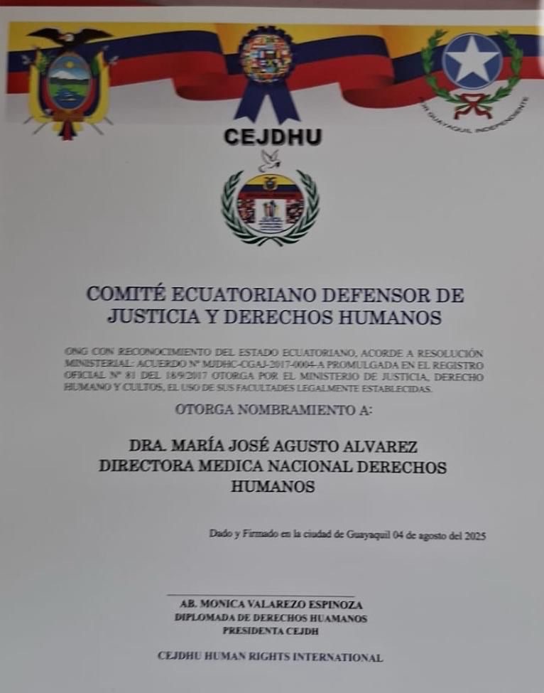 🩺 A estos honores se suma su reciente designación como Directora Médica Nacional de Derechos Humanos por el Comité Ecuatoriano Defensor de Justicia y Derechos Humanos (CEJDHU), en reconocimiento a su compromiso con la salud pública y la equidad en el acceso a la atención médica.